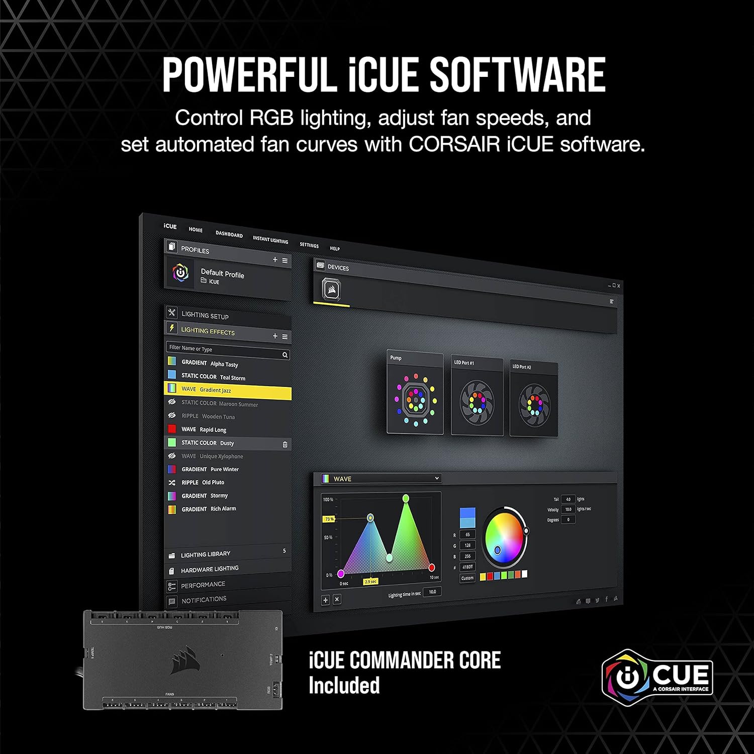 - Includes a corsair icue comm ander core smart rgb lighting and fan speed controller, for precise speed and lighting control for up to six rgb pwm fans