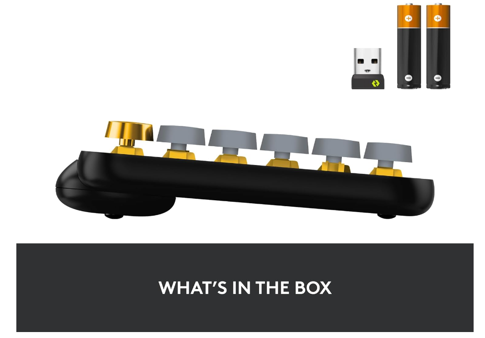 - Get loud, get retro: Shout your inner retro out loud with a bold color combination of black, grey and arcade game yellow, allowing you to make a performance with POP Keys wireless keyboard in Blast